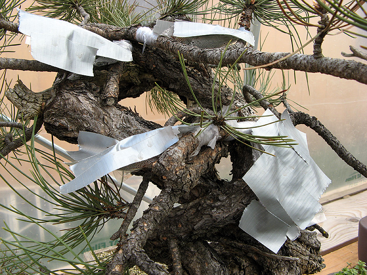 The first photo: A few grafts on a bankan (twisted-trunk) Ponderosa pine. The scions are a black/red pine hybrid, which I chose for the thin Red pine-looking needles. This tree has a very Red pine feel to it. And ponderosa foliage on small and moderate sized trees just does not look good to me. I know for some this is controversial, but it does look a lot better than the ugly grafted trees we see with black pine base and white pine top. And it is a way to use the wonderful material we have in a new way.
