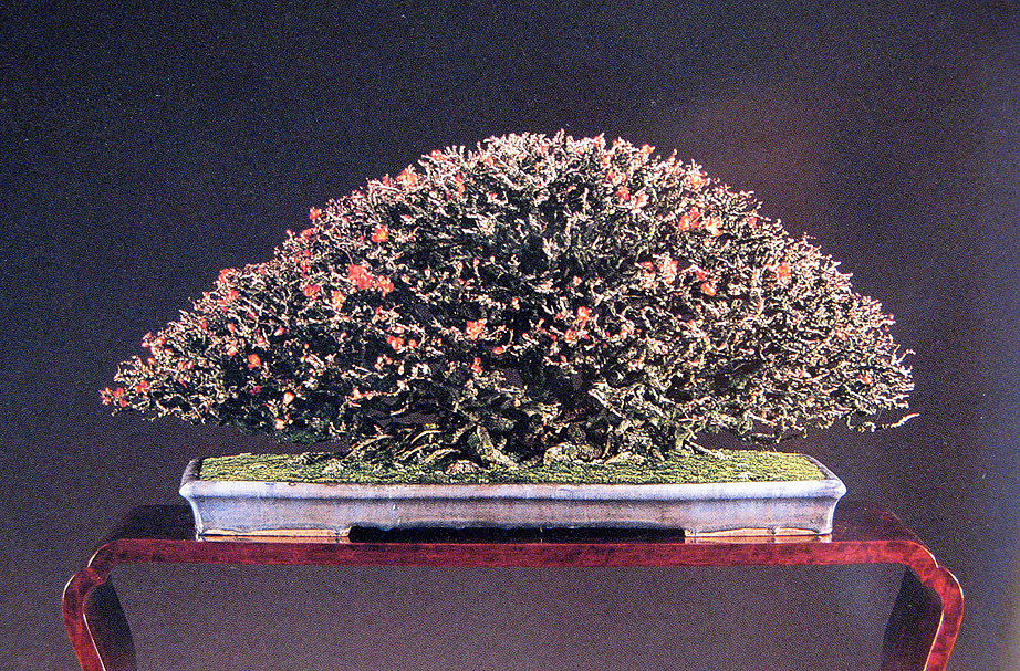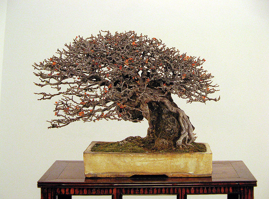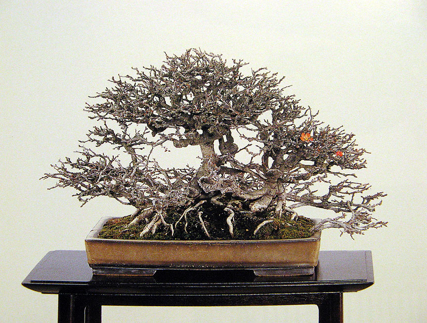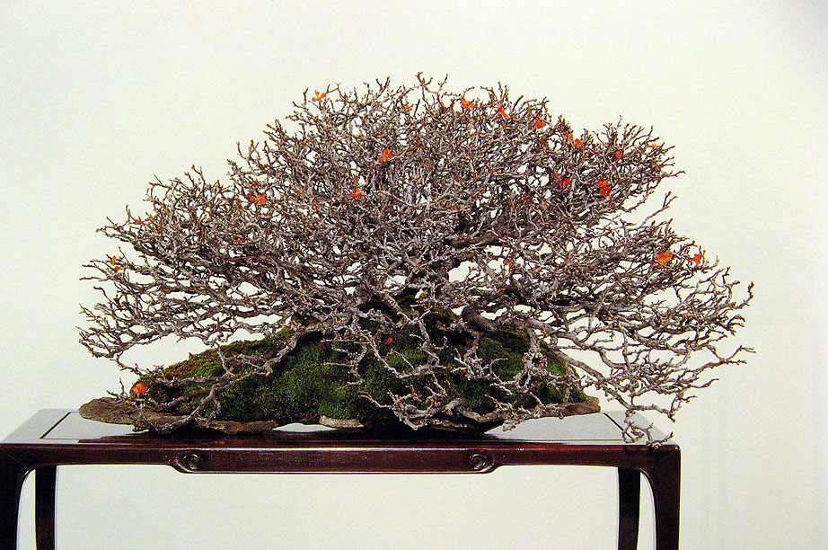 The vast majority of Chojubai grown for bonsai are the red-flowered variety; all the other photos in this gallery are of red-flowered trees. This is a white-flowered tree and it won a Kokufu prize. Very hard to ramify the white ones. 33 cm