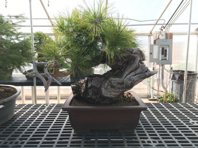 This massive Ponderosa pine was repotted this week into its first bonsai pot. It had been in a box for about 6 years so the root growth was pretty impressive. We’d grafted it with Black pine a few years back.