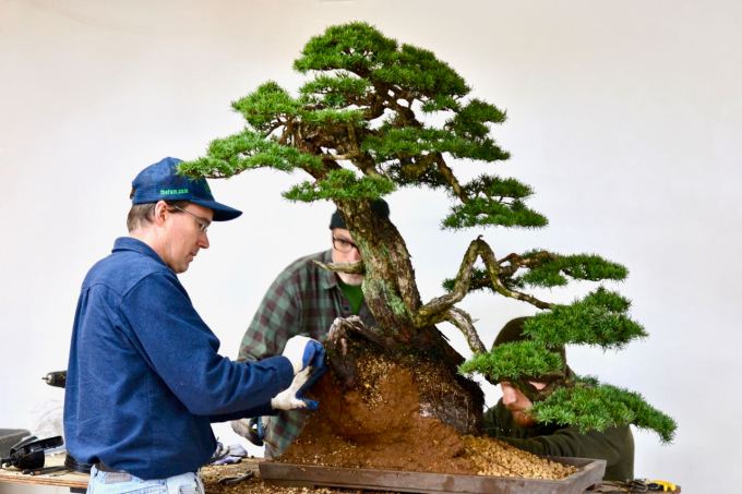Some of you may remember the restyling of this large, old Mountain Hemlock, Tsuga mertensiana, a few years ago. This spring the wooden box it was living in was replaced with a low ceramic rectangle. The following is a photo essay of this final step in the progression-