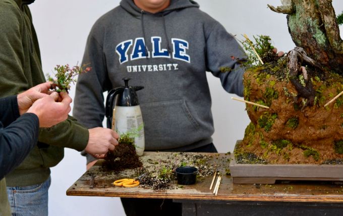 And this is the tree in spring of 2018, in the studio on potting day. One of the many curiosities about this tree is that it is a rooted branch that self-layered in the soil.
