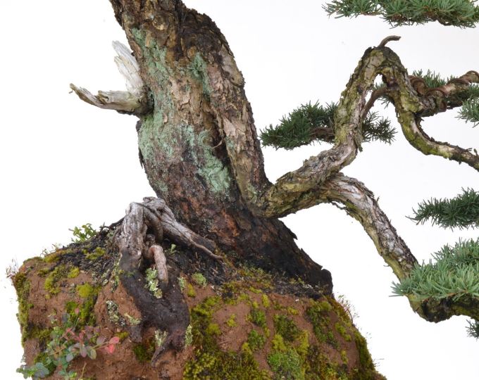 The completed composition, 36″ / 91 cm. We patched in some moss to jumpstart the desired result of full eventual coverage. The environs of Mountain Hemlock often have great views, high up on rounded terrain with vistas. The cascading drop branch does remind me of being in high country, brushing the clouds, where I’ve often see them. Very old Hemlock in this zone often have idiosyncratic branching, and in the restyling a few years back we tried to feature the lines of these unusual branches that were created in the wild, without influence or manipulation in the studio, simply by choosing an inclination and front that showed off the branches to the best advantage — the decision being that the branches were more interesting than the trunk. In the potting this spring it seemed advantageous to make a high mound to show off the lowest branch, leaving the container with a very minor supporting role.