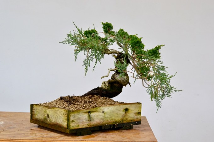 The juniper is a bit of a Frankenstein: The trunk is a Rocky Mountain Juniper (thank you Backcountry Bonsai, Steve and Dan) and we it grafted it with itoigawa about 4 years ago. The tree is only about 6″ high, and itoigawa seemed like the right choice for the fineness of the foliage and the small tree size.