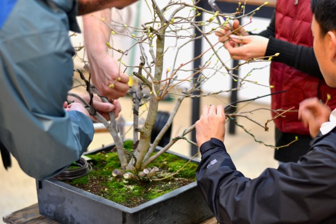 Seasonal students beginning to wire. Some of the wires, the green wires, were wrapped with paper tape, which allows a bit of softness between the wire and the branch. (We didn’t do them all, it was just a teaching moment.)