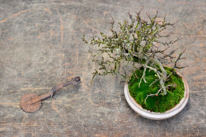 Some further thoughts: One of the reasons this strikes me as a bit beyond what we can call bonsai, at least at this time, is that the riding spur introduced content well outside of what bonsai usually allows. A bonsai container or support or slab is content-less, or as much so as possible. It is a construct, a fiction, and a nearly blank one. The focus is on the tree. With this chojubai composition, the spur carries with it a gross ton of content. Visually it’s active, but also it’s historically weighty. This is the opposite of what bonsai tradition currently allows. It may well, amoeba-like, embrace things like this in the future, but I think it would be a stretch to say the main tradition includes this now. Still, it’s fun to play, for play is its own reward.