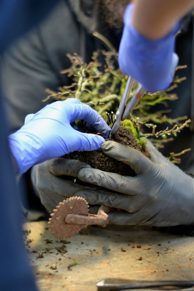 Zach using a persuader…a rawhide mallet that sees frequent use at repotting time