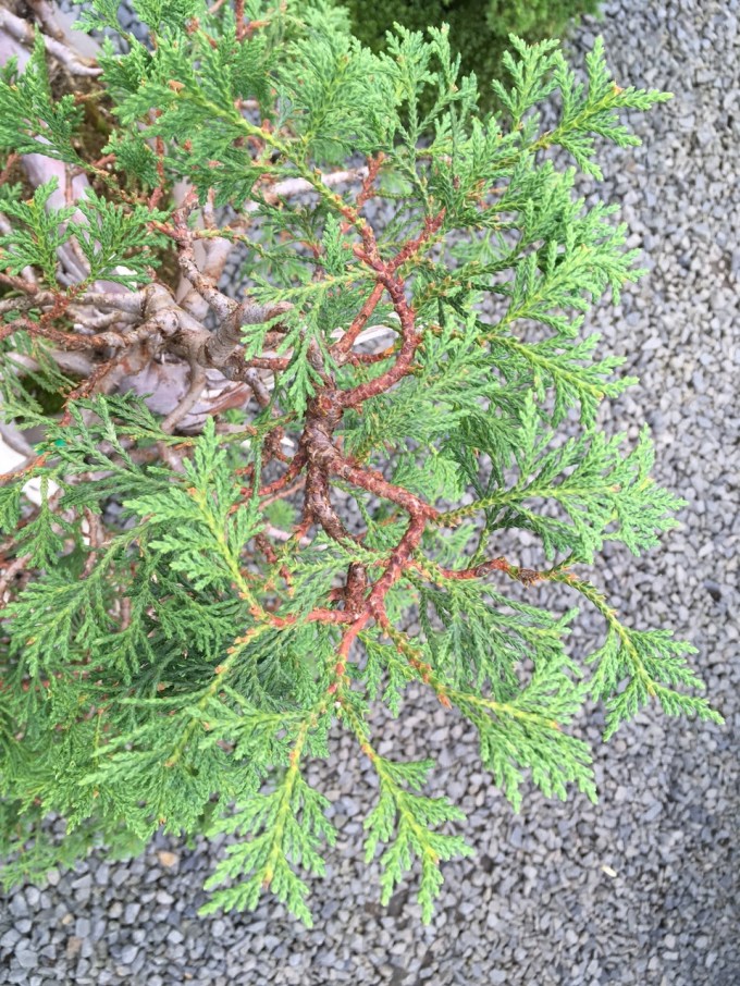 A Yellow Cedar, Cupressus nootkatensis, with all shoots trimmed and prepped for wiring, using the curiously less effective ‘all-at-once’ technique