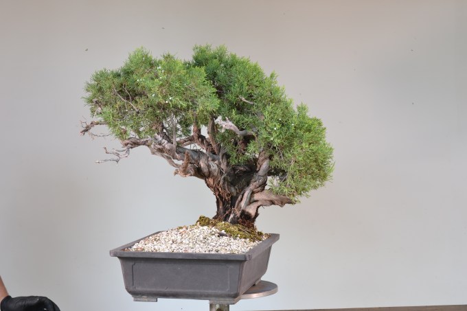And here it is after the first styling. There are no less than 4 trunks / leaders on this tree. From this front we were able to get three trunks visible, and with a tip to the left allow one of those dominance, and suggest flow as well. Although the tree-like form was the thing that intrigued me about it, a supporting intrigue was the snarls of jin beneath the canopy. This is exactly what I’ve seen on tree junipers like the Sierra Junipers in Yosemite. Often we style junipers with the jin to the exterior of the form, or on top, which is exciting and I do that as well, and yet dead branches beneath higher branches is a bit more accurate out in the wilds with the tree-type junipers, having died off underneath the higher ones. Though I rarely shorten or manipulate jins, I don’t like hard rules, either, and in this case shortening a couple of the long straight ones brought more attention to the remarkable twists in the trunks. Finding a balance in all the competing elements, and choosing which is most important while not losing complexity is not an easy dance. Hope you enjoyed our attempt.
