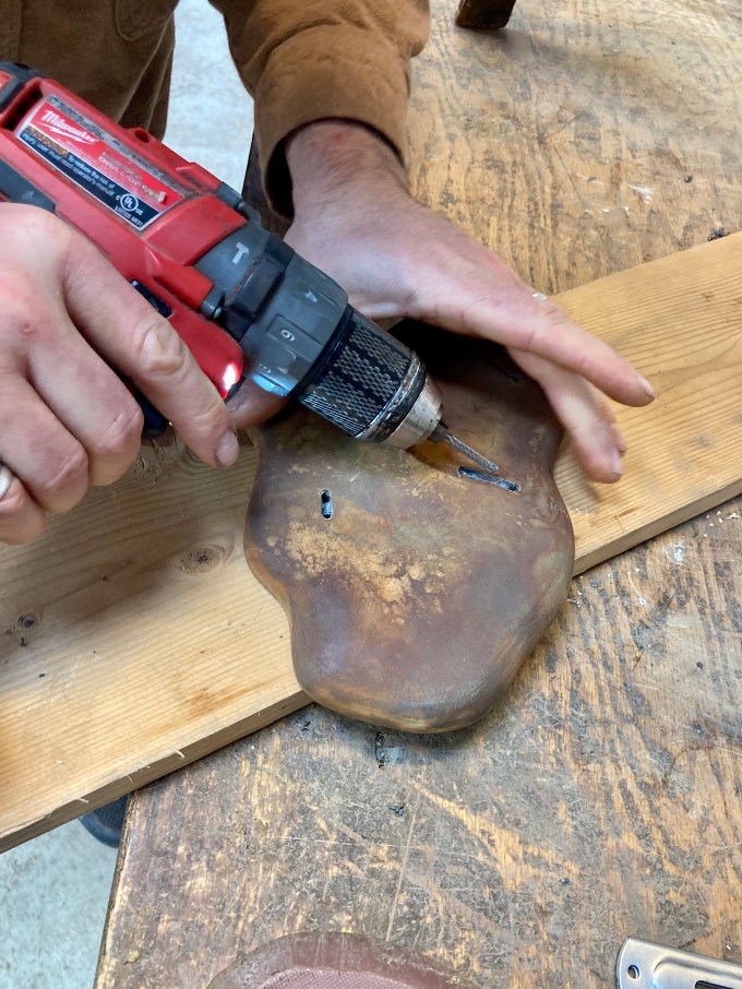 This was amazing. Collaborator Kevin Bennett made our 3D-printed slab, which is plastic. What was so cool was he found printing material that had fine iron dust in it. Which meant we could patina it and have it blend in with the patinated metal support. That’s the marvelous earthy-toned thing we’re looking at here, rusted plastic. Erich, my other collaborator, is making wiring holes.