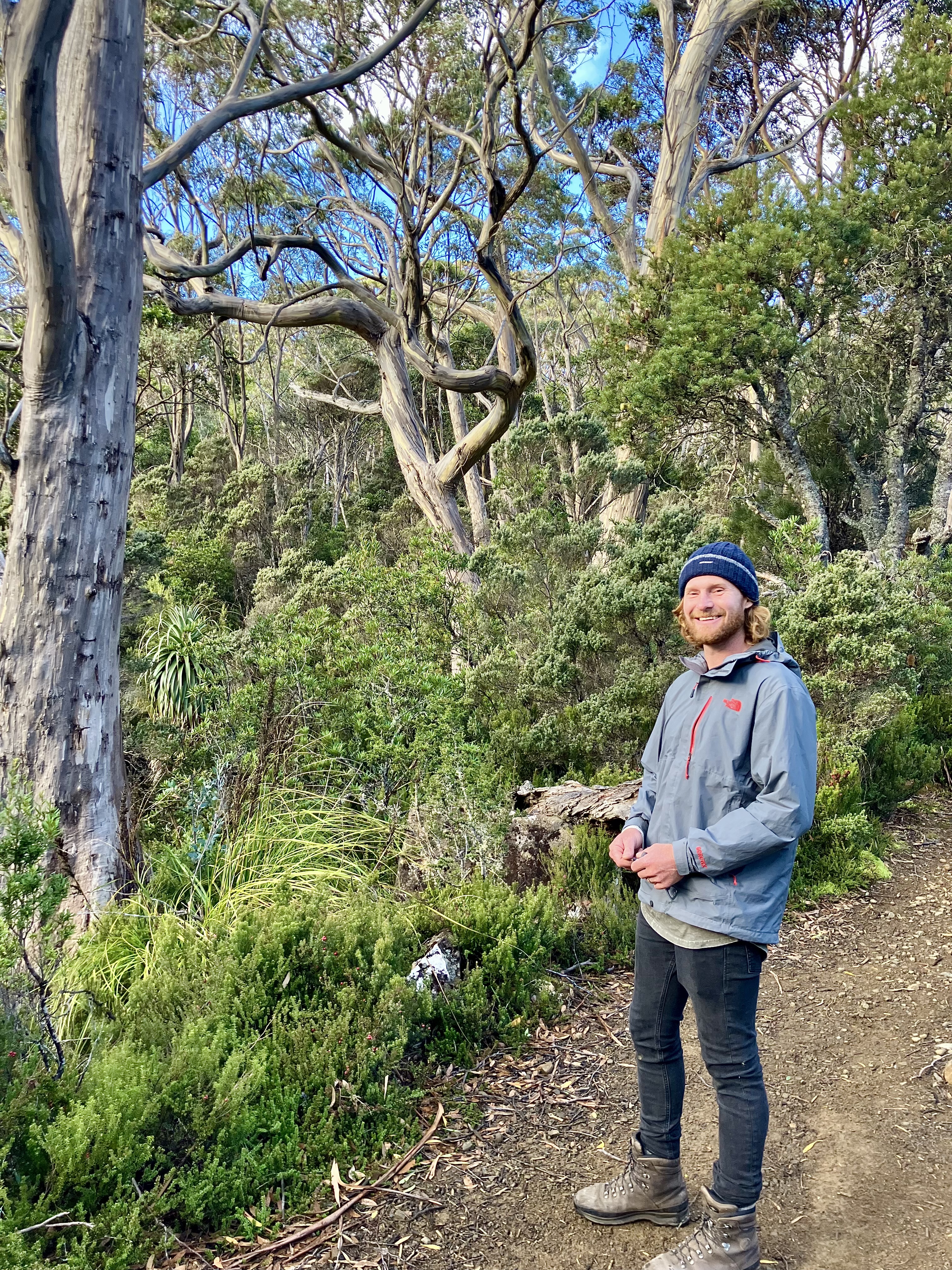 I’d seen what Jarryd was up to on Instagram and had to see it all in person—his work, and the insane and beautiful Tasmanian natives he prefers. We met at the airport outside the quiet main city Hobart, Jarryd looking as scruffily dashing as when he visited me with his fiancé Hannah in 2018.