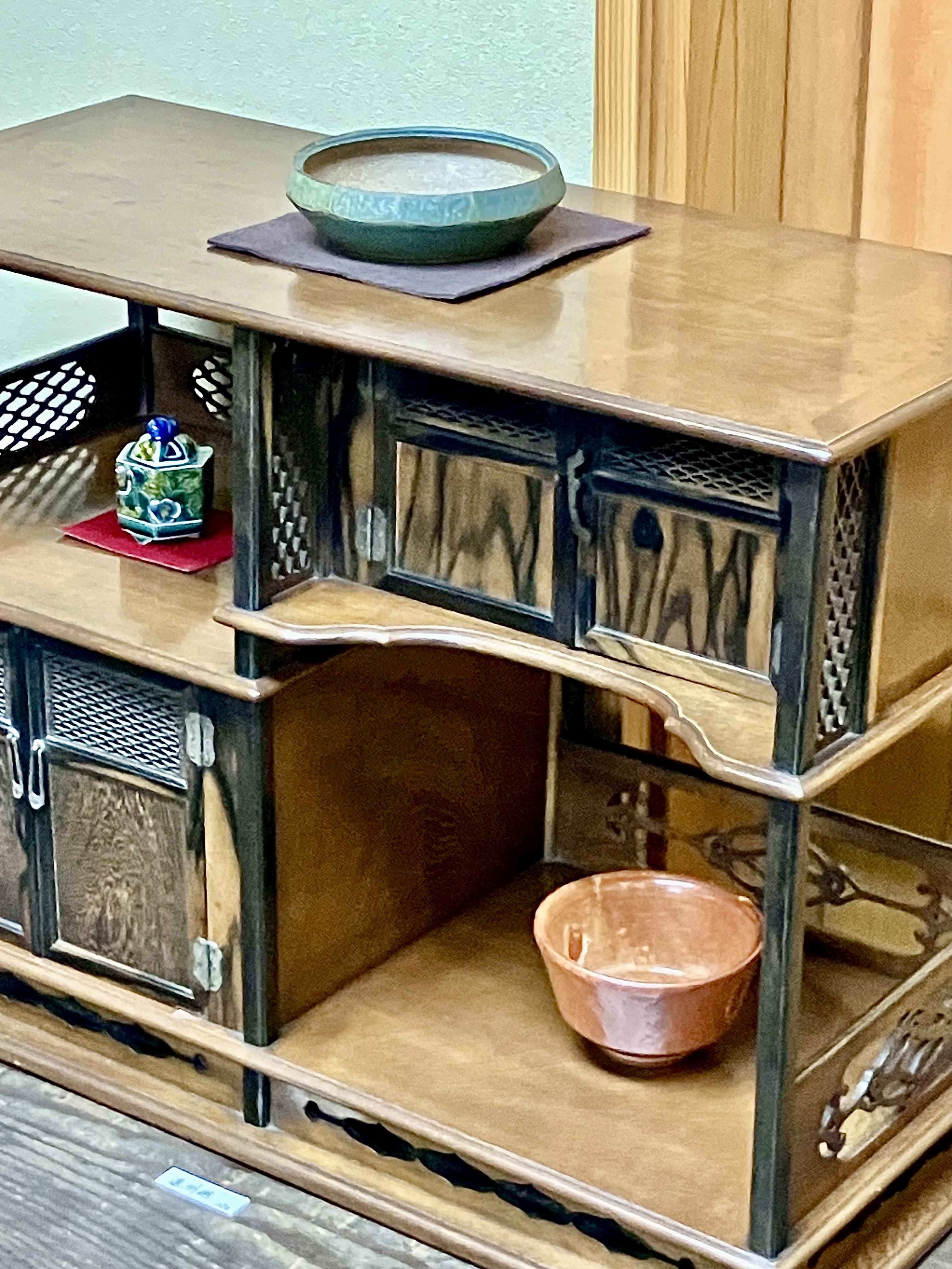 Reunited with my group, we went to Mr. Suzuki’s garden. He met us in the teahouse, and brought out two pots, setting them on this wooden stand.