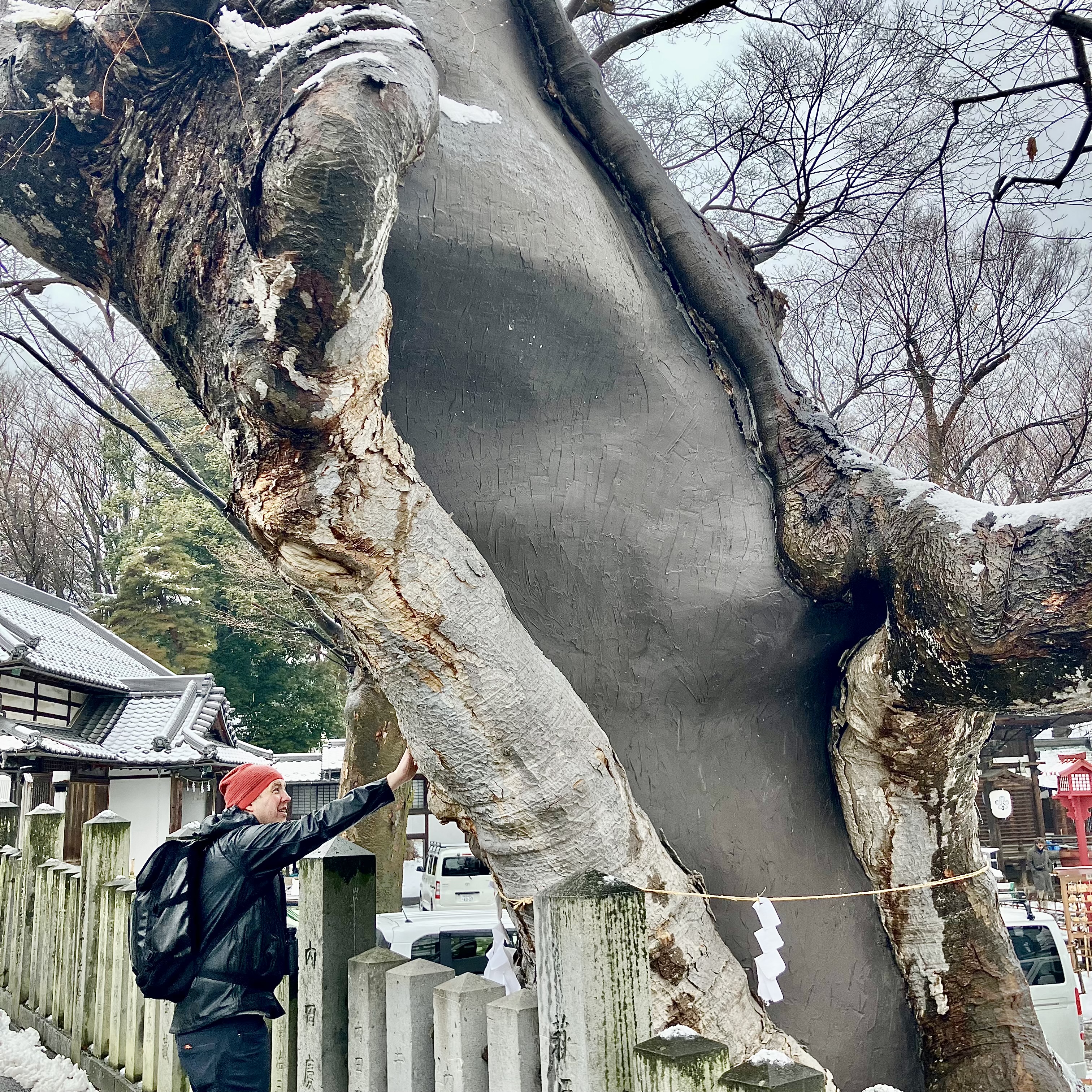 Evan with a ridiculous Zelkova. A concrete filling or something similar supports the hollowed trunk. The white paper zigzag in front of the trunk is called a shide. These protect from evil and purify a place, and its presence suggests the building beyond is a Shinto shrine.