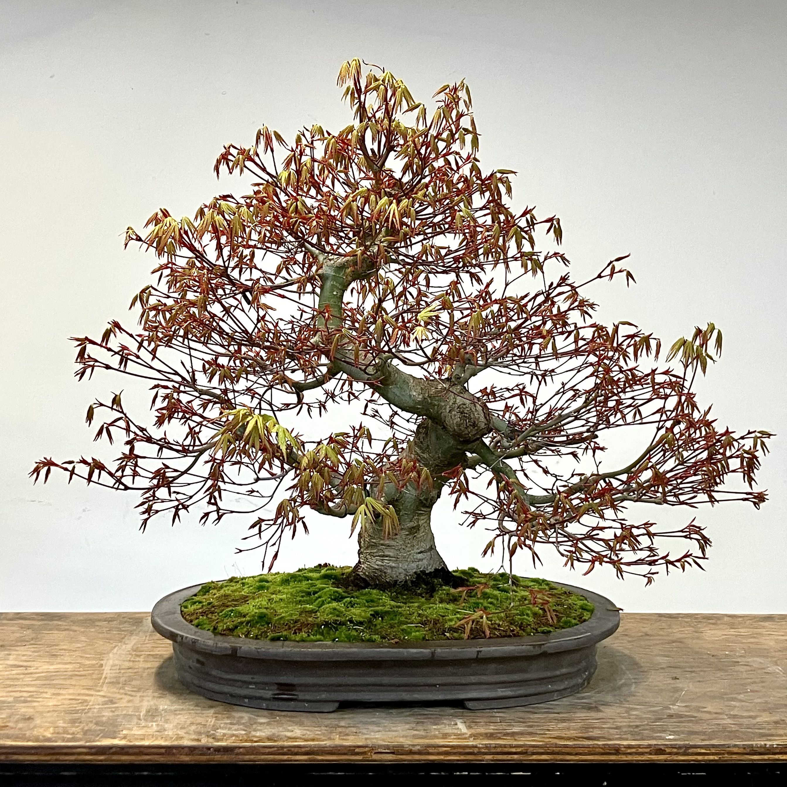 This 20-year old Japanese Maple has never been pinched. Freely grown, a maple will have a coarse shoot structure, but this early period of no pinching develops the trunk and branches and roots.