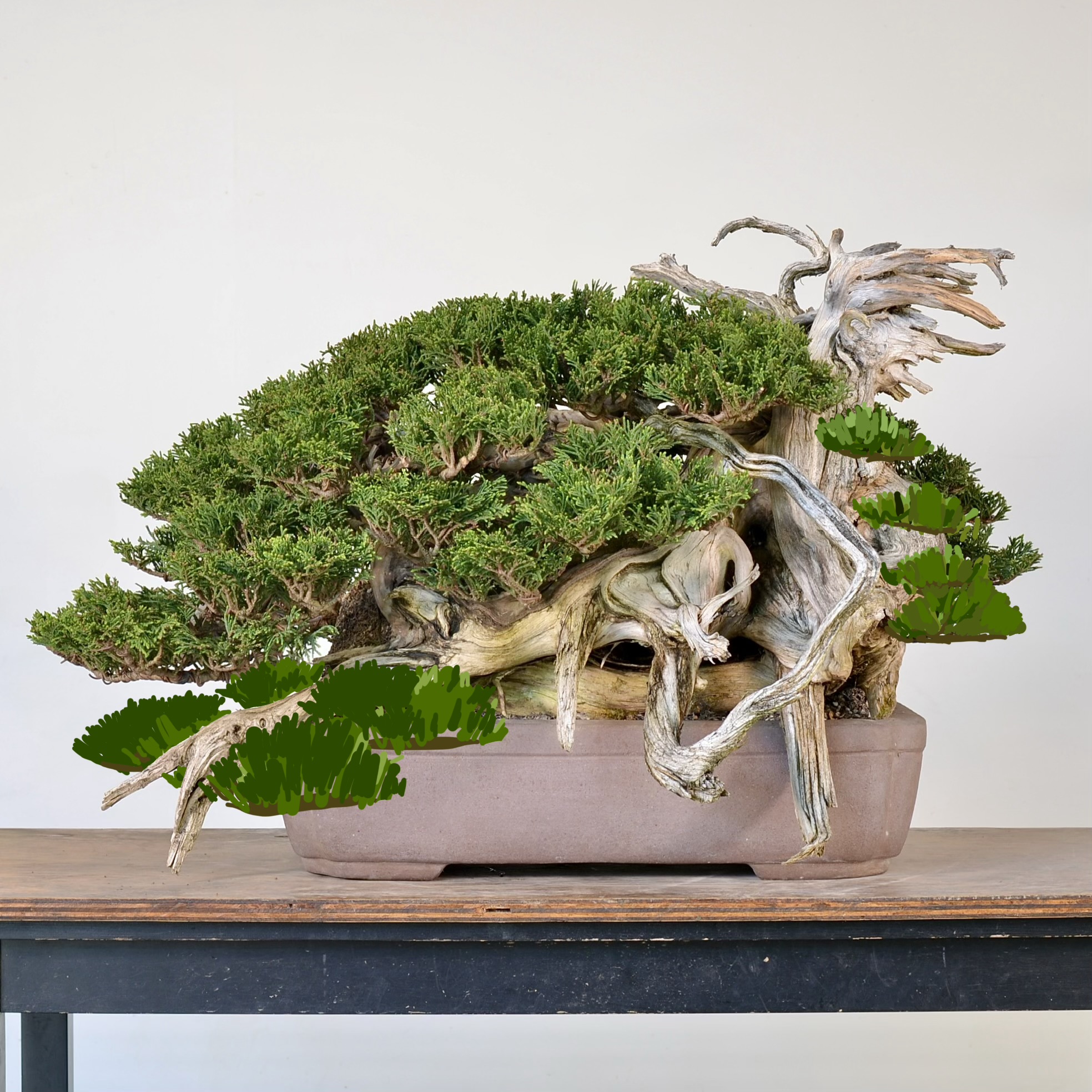 This digital redo is closer to what we expect from integrated design. The foliage cups the deadwood, as if accepting it. Any sensible bonsai artist would choose this design.